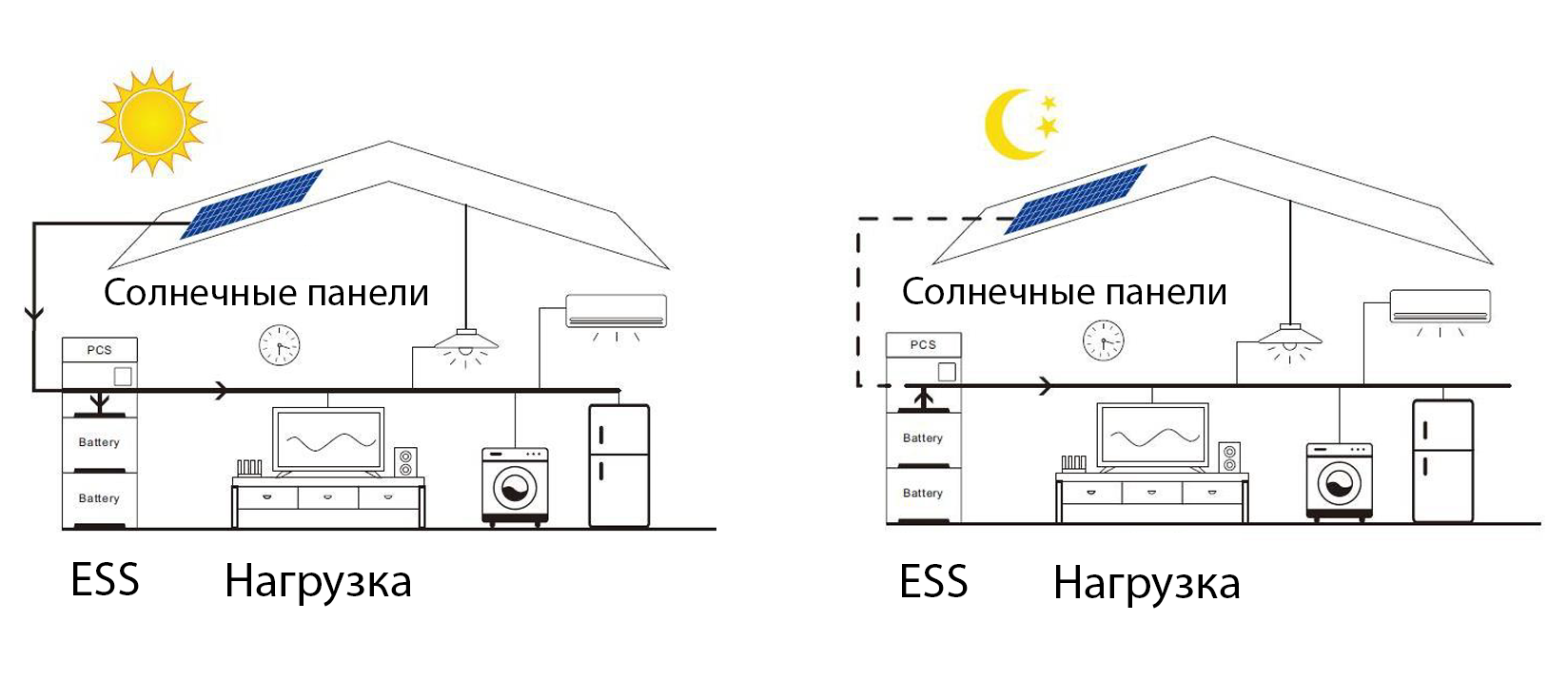 - Использование накопленной энергии в часы пиковых тарифов – система заряжается в период низких тарифов (ночью) и отдаёт накопленную энергию днём, когда стоимость электричества выше, что снижает плату за электроэнергию и позволяет избежать переплат