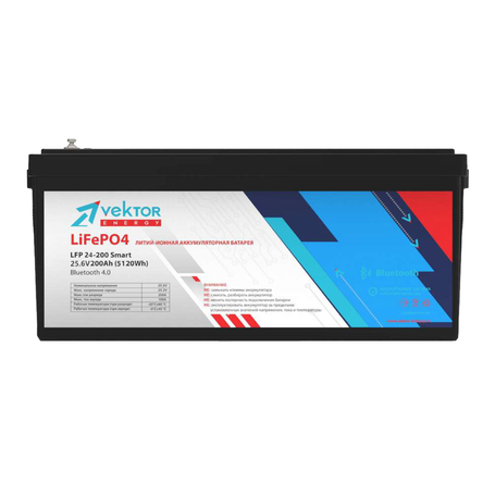 Аккумулятор Vektor Energy LFP 25.6-200 Smart оснащен системой управления Smart BMS, которая обеспечивает полный контроль всех процессов. Она предотвращает перезаряд и глубокий разряд, контролирует температуру, балансирует ячейки и защищает от короткого замыкания и обратной полярности. Интеграция с гаджетами через Bluetooth позволяет легко управлять аккумулятором.